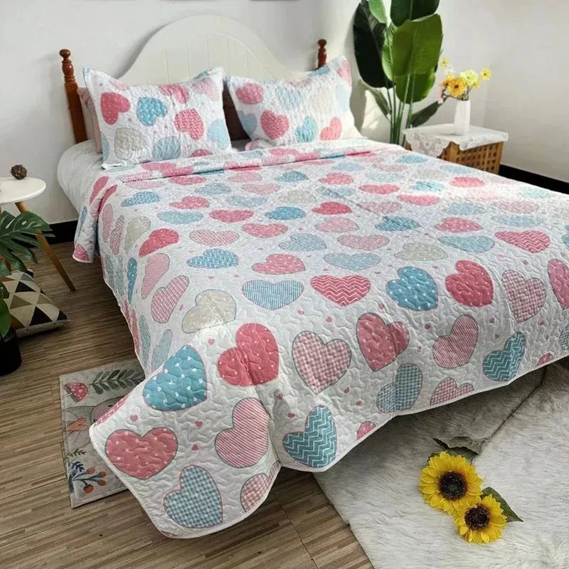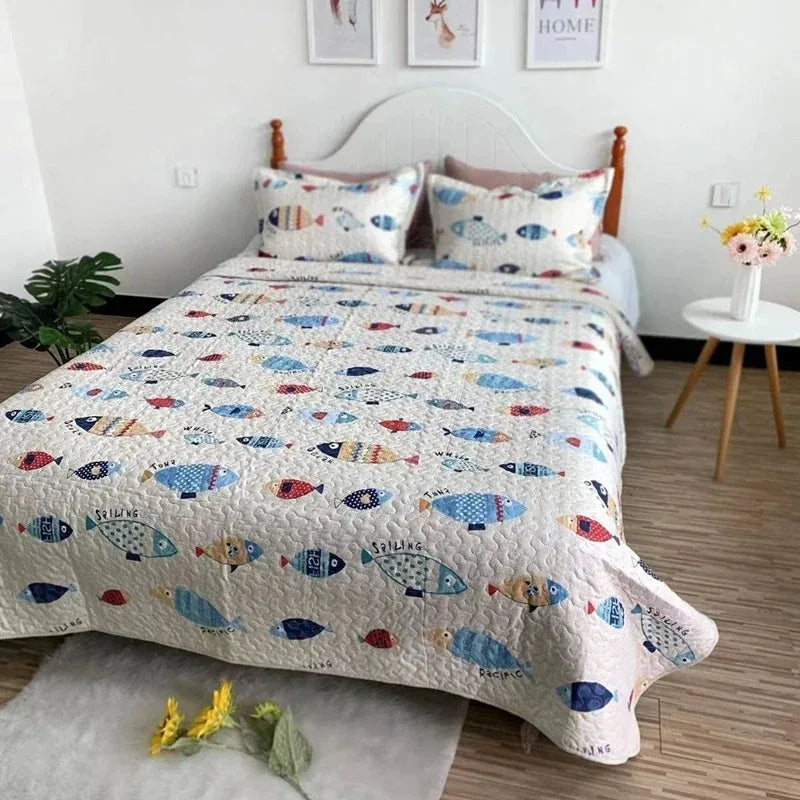 Brighten up your bedroom with our Bedspread Set! Made from soft washed cotton, this set includes a bed cover, two pillowcases, and a printed quilt. Perfect for summer, it's available in twin or queen sizes and can also be used as a coverlet or bed sheet. Sleep in style with this versatile bedding.