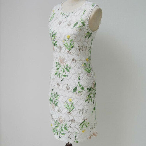 This is a black and white lace dress with O-shaped neckline and no sleeves for ladies with sexy figures.