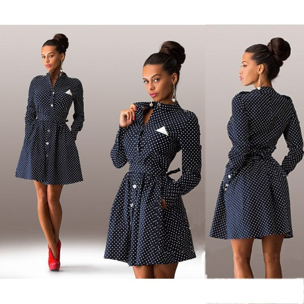 This fashionable piece is off the chart gorgeous. The polka dots long sleeve buttons down the front dress accentuates the waistline with a band. Get this elegant piece now.