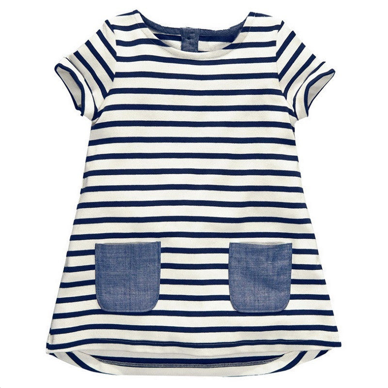Short-sleeve knee-length summer dress for little girls. It has an O-Neck with a regular sleeve style and a strip pattern.