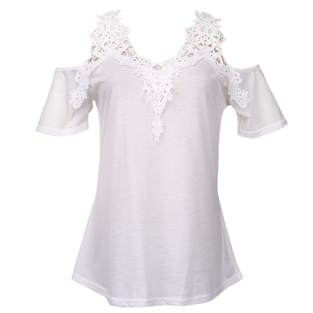 This Women Loose Lace Patchwork off Shoulder Tops Short Sleeve Shirt features: