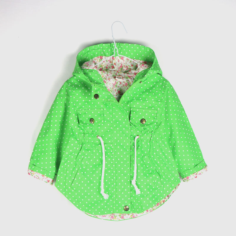 Hooded, polka dot pattern, long sleeve, cotton made children jacket, available in yellow, pink, green and rose red color variants.