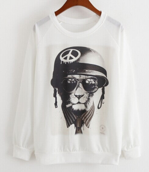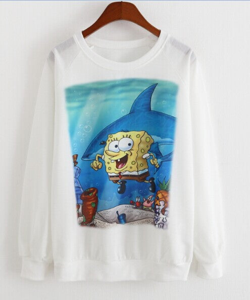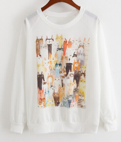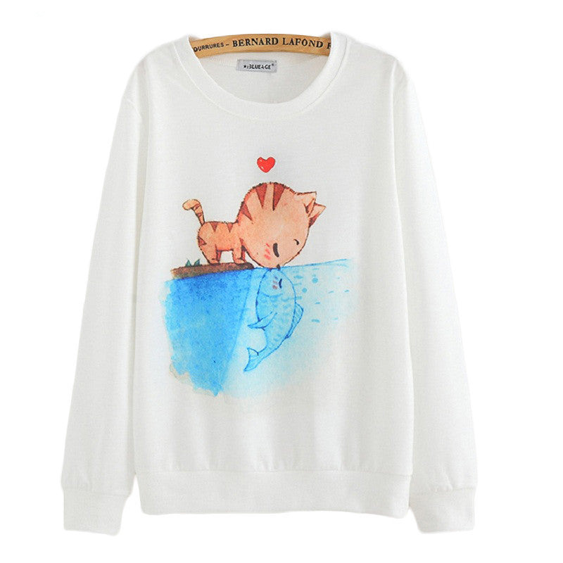 A round neck sweatshirt for ladies with longsleeves and plain white color. The sweatshirt is hooded and has cat and fish prints on it.