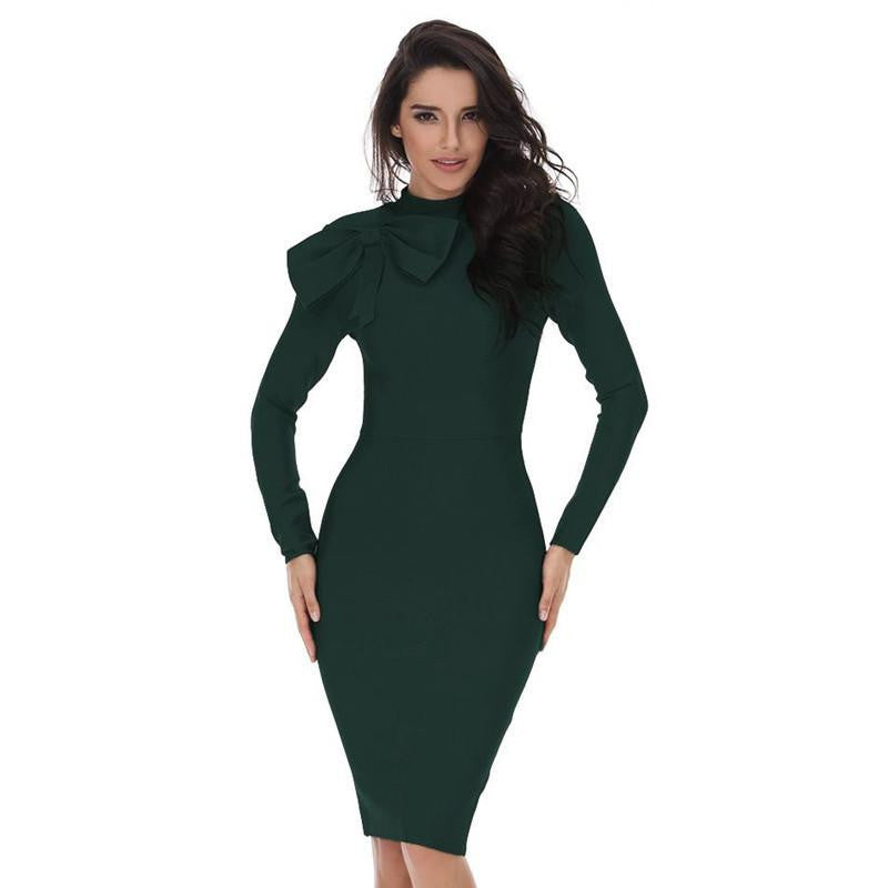 Elevate your winter wardrobe with our women Winter Bodycon Dress long sleeve high neck red dark green bow knee-length celebrity sexy bandage dress. This stunning dress is designed for the modern woman who wants to make a bold statement while feeling comfortable and confident. With its full-length sleeves and high neck, this dress will keep you warm during those chilly evenings while accentuating your curves in all the right places.