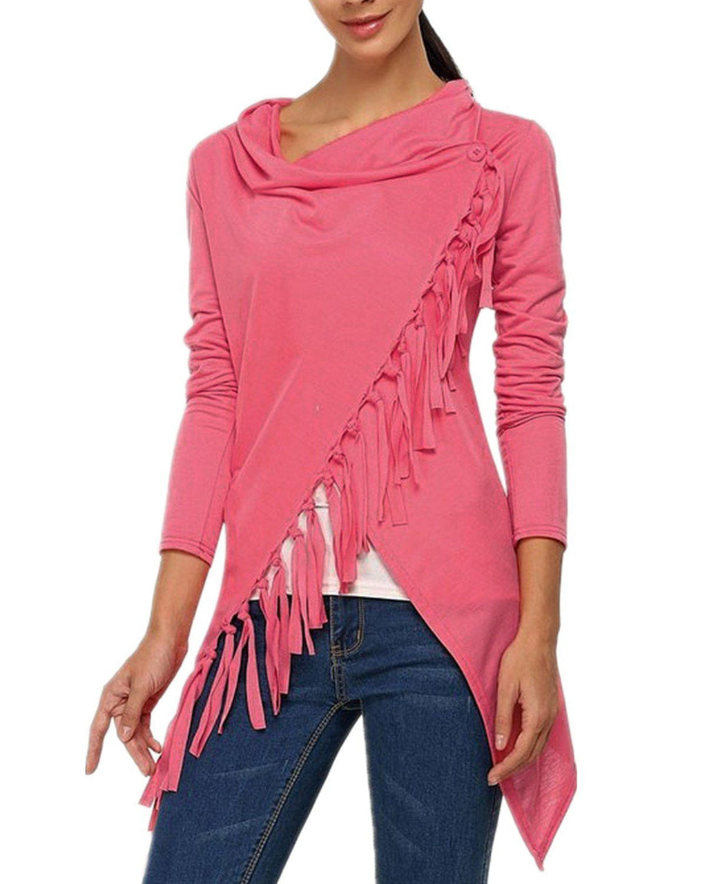 Elevate your wardrobe with our Women Tassels Irregular Hem Long Sleeve Blouses Shirts Casual Cardigan Solid Color Plus Size Tops. This stylish piece is designed for the modern woman who values both comfort and fashion. With its unique tassel decoration and irregular hem, this blouse is perfect for making a statement on any casual occasion.