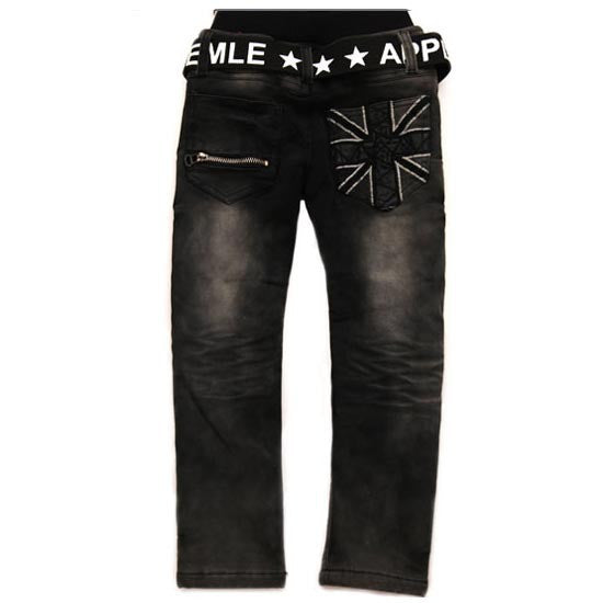 Novelty style, elastic waist, geometric pattern, loose fit, black color with white patches/prints jeans for boys from 2-12 years old.