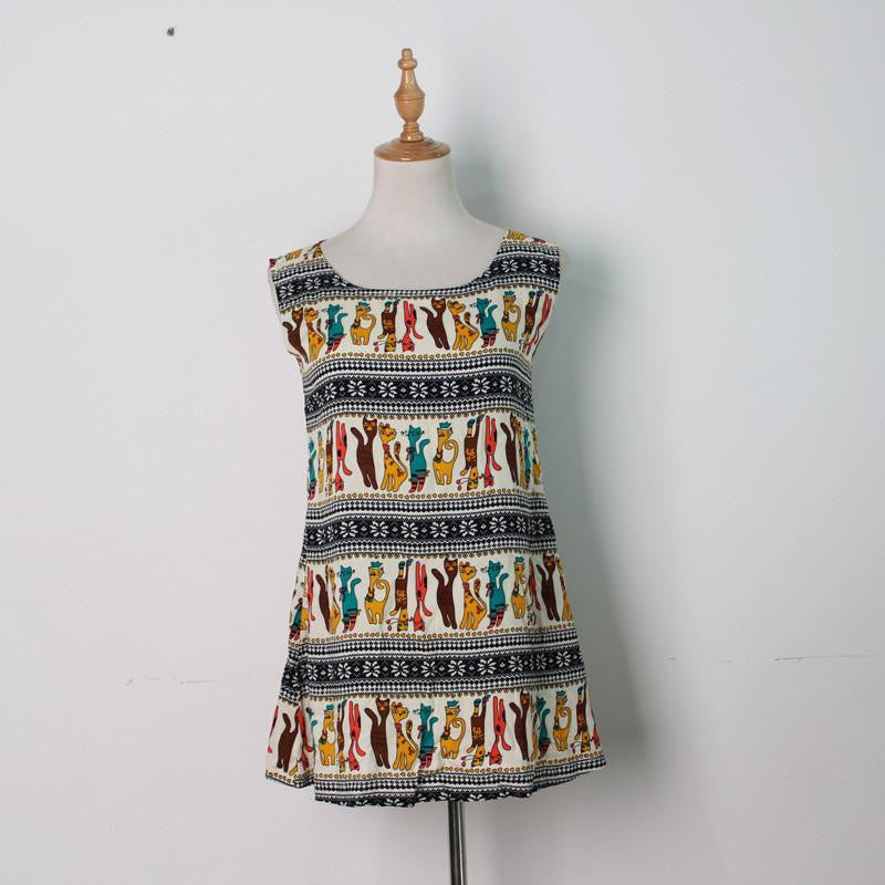 Best round neck cartoon printed dress is a cute summer dress. This above-the-knee dress is Sleveless and comfortable.
