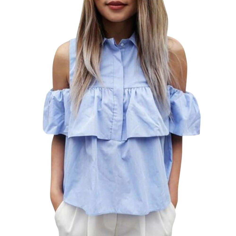 Elevate your wardrobe with the stunning Women Off the Shoulder Ruffles Blouse Shirts Turn Down Blue Casual Tops Work Office Ladies. This chic and versatile blouse is designed to complement your style, whether you're heading to the office or enjoying a casual day out. The elegant ruffles and off-the-shoulder design add a touch of femininity, making it a perfect choice for any occasion.