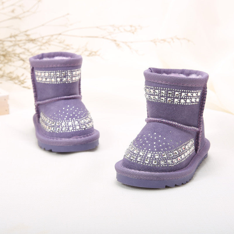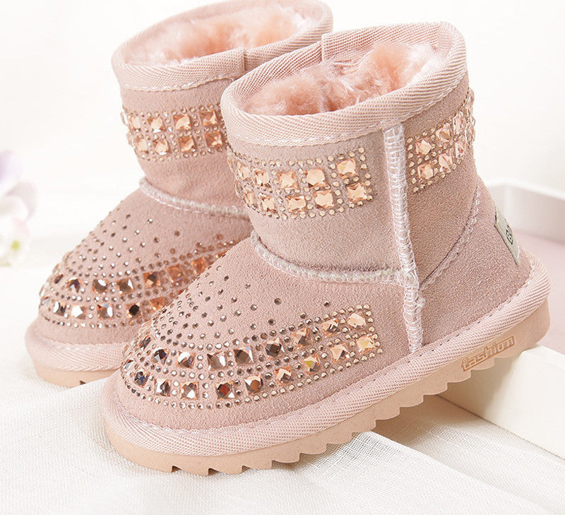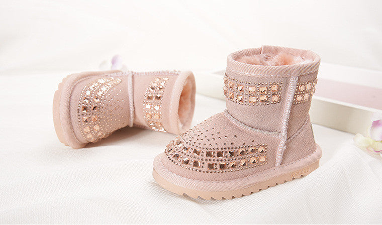 Introducing our Winter Fashion Children Snow Boots rhinestone Kids Leather Boots Warm Shoes With Fur Princess Baby Girls Ankle Boots, the perfect blend of style and comfort for your little ones this winter! These mid-calf, flat heel boots are designed to keep tiny toes warm and cozy while ensuring they look fashion-forward during outdoor adventures.