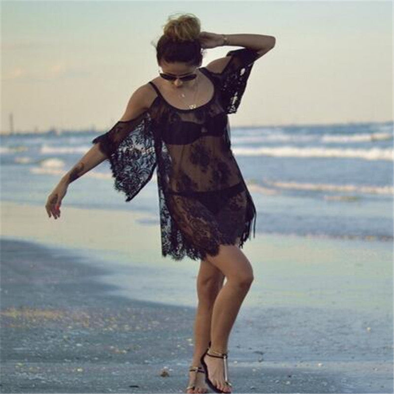 This beautiful lace cut-out shoulder black pullover is perfect for the beach. Get the stunning mid-thigh fully laced deep scoop neckline pullover this summer.