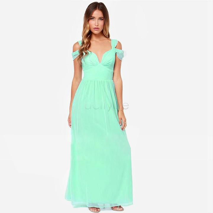 Look sexy this summer with this almost off the shoulder long flowing chiffon dress. This deep side slit adds sophistication and elegance to this piece. Order your beautiful chiffon gown now.