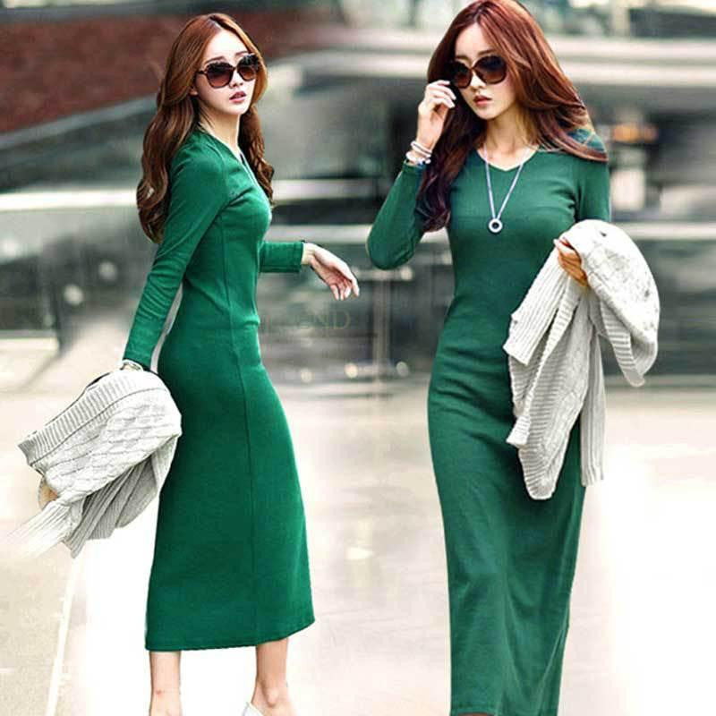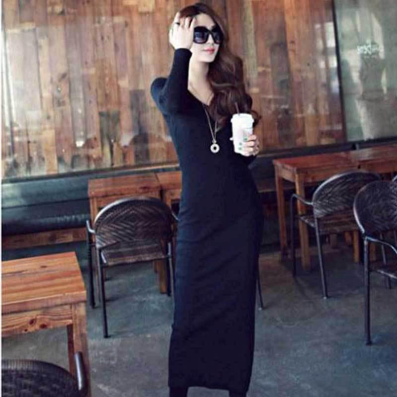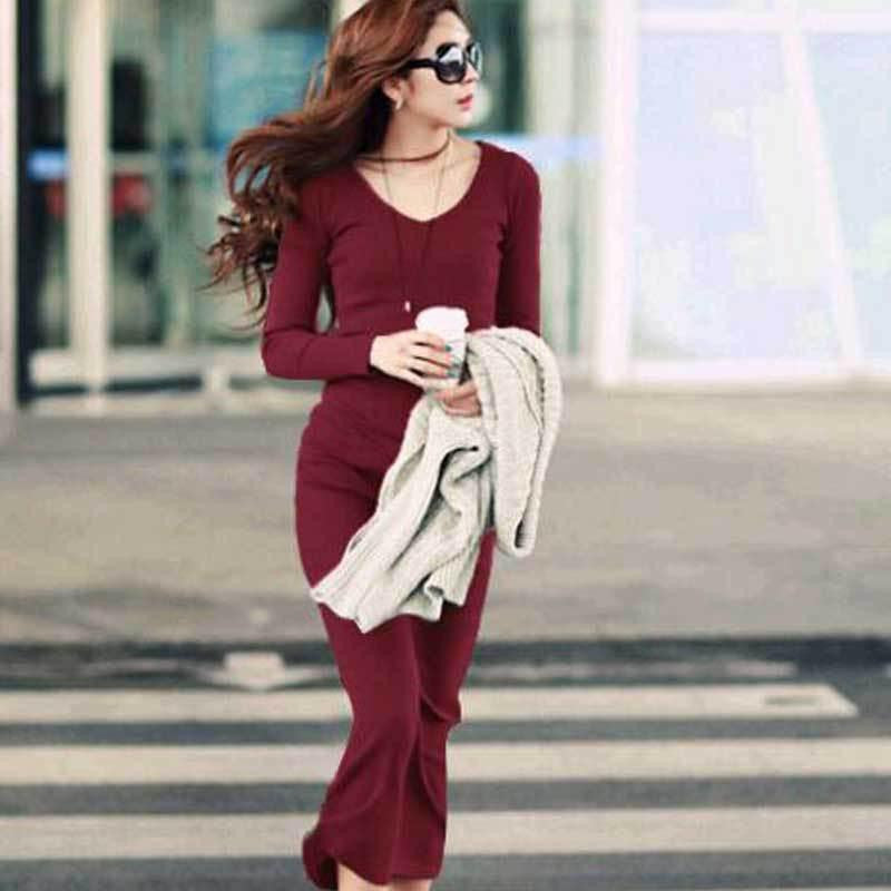 The solid full length dress is perfect for any season get this natural waist line long sleeve v-neck slim fit dress today.