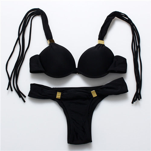 Featuring a unique fringe tassel design, this bikini set stands out with its bold colors like Orange, Sky Blue, and Rose Red. The low waist cut and push-up support enhance your natural curves, making it a must-have for your summer wardrobe.