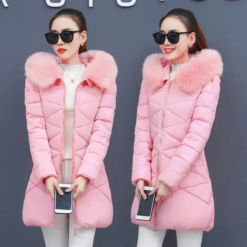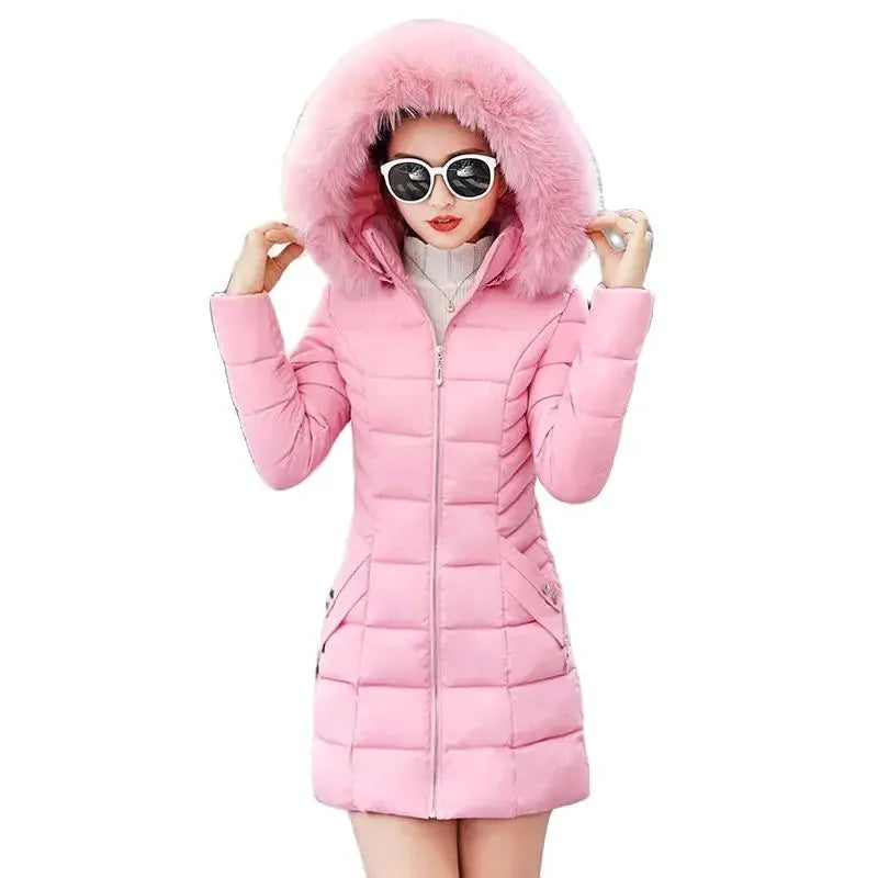 Introducing the ultimate solution to winter chill: our Winter Parkas Women Cotton-Padded Jacket Women's Fur Collar Cotton Liner Jacket Slim Long Thick Coat Hooded Female. Designed with your comfort and style in mind, this coat is perfect for anyone looking to stay warm while maintaining a fashionable appearance. The luxurious fur collar not only adds elegance but also provides a snug fit that keeps the cold at bay.