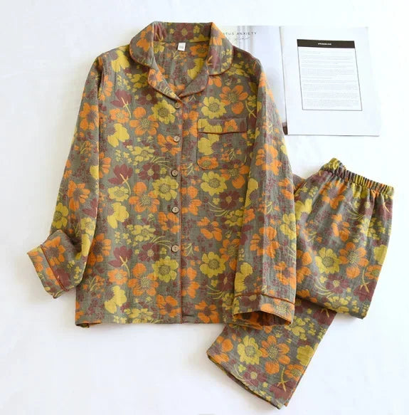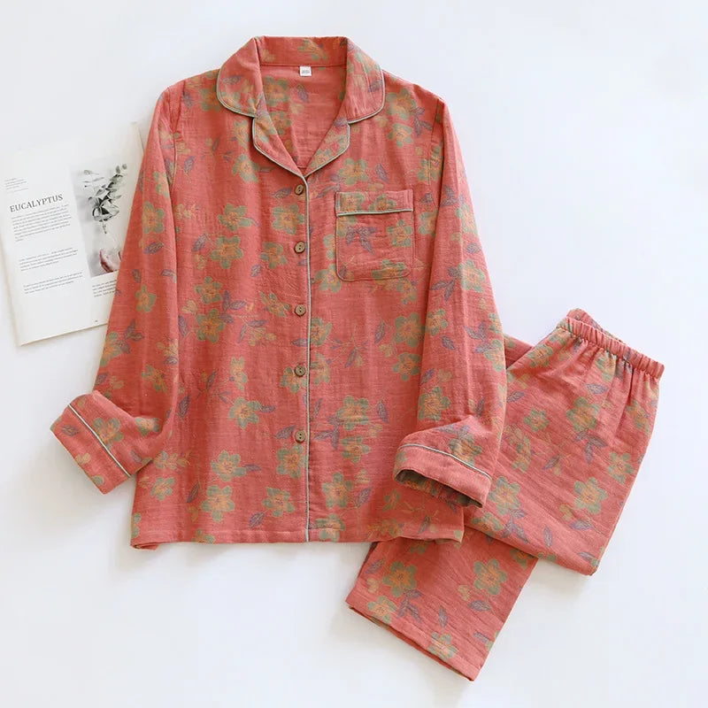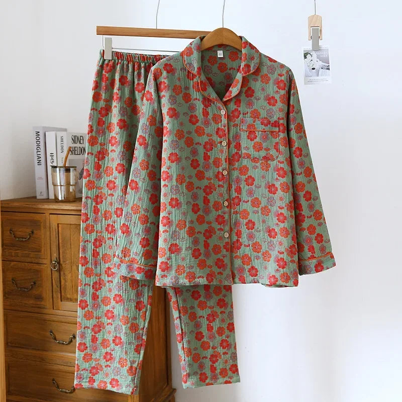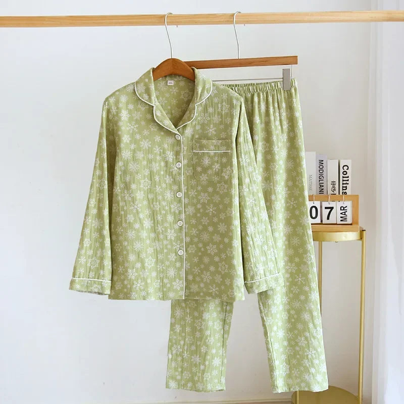 Experience ultimate comfort and style with our women's pyjamas suit long-sleeved trousers two-piece 100% cotton crepe flower leaves home clothes. Designed for relaxation, this two-piece set is crafted from 100% cotton crepe, ensuring breathability and a soft touch against your skin. The elegant floral and leaf patterns add a touch of charm, making it perfect for both a peaceful night’s sleep and leisurely mornings at home.