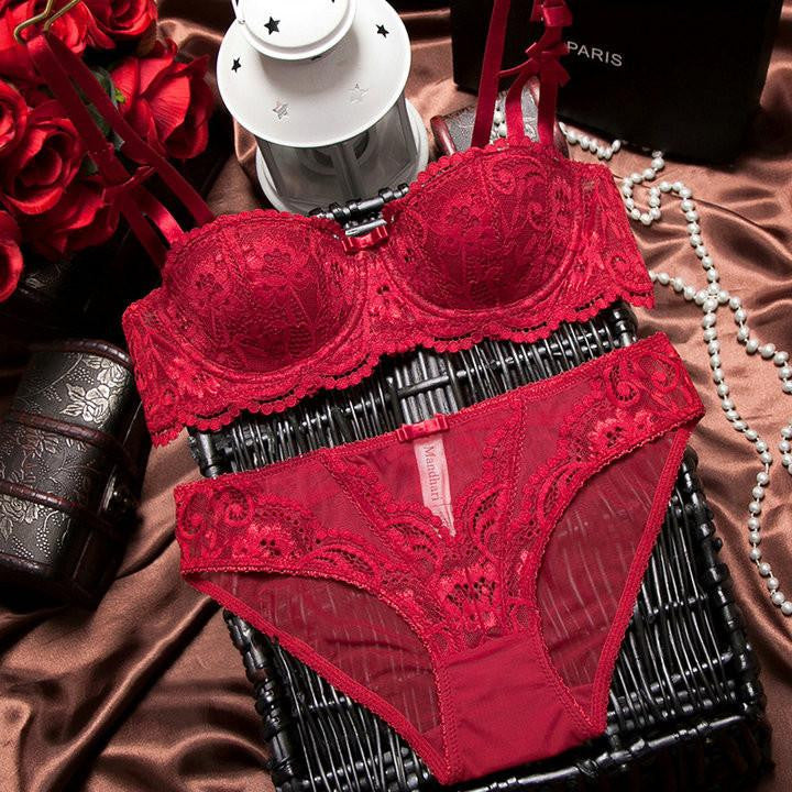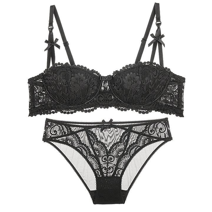 Get the beautiful lace brief and bra set. Elegant and sexy with a deep plunging front. Solid colors for your convenience. Comes in red, black and white. Wear this beautiful lace bow set and feel sexy but comfortable.