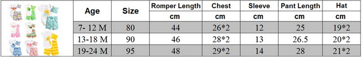 Charactered patterned three pieces cute unisex baby rompers. It also comes with a stylish head warmer and good summer season.