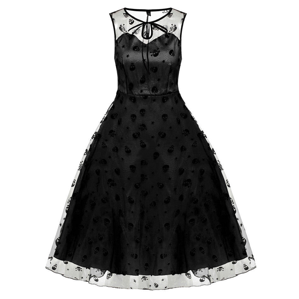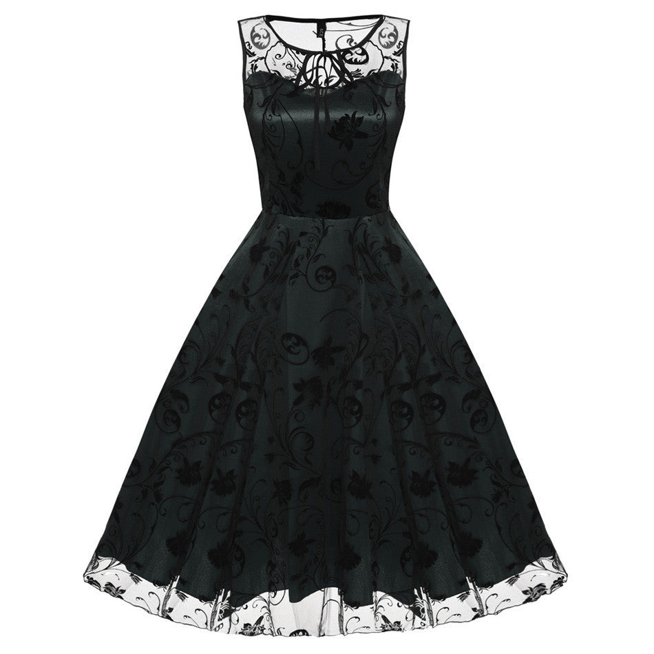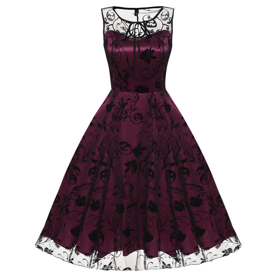 Step into elegance with the Retro Women Vintage Style Sleeveless Mesh Embroidery Long Cocktail Party Dress Flower Skull Ball Gown. Perfect for cocktail parties, graduation balls, or casual outings, this stunning dress combines vintage charm with modern flair. Featuring exquisite embroidery and a unique flower skull design, this dress is sure to turn heads and make you the center of attention.