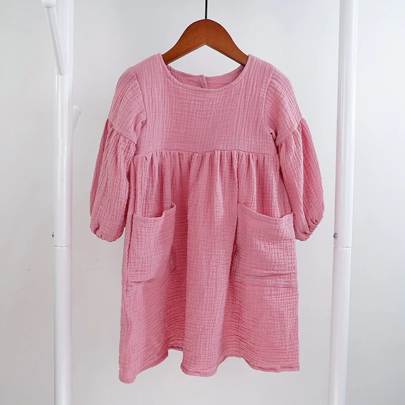 Let your child express her unique style with our Children's Organic Cotton Double Gauze Loose Pockets Baby Girls Dress Fashion Princess Casual Kids Dresses. This beautiful, functional dress is a must-have addition to her wardrobe!