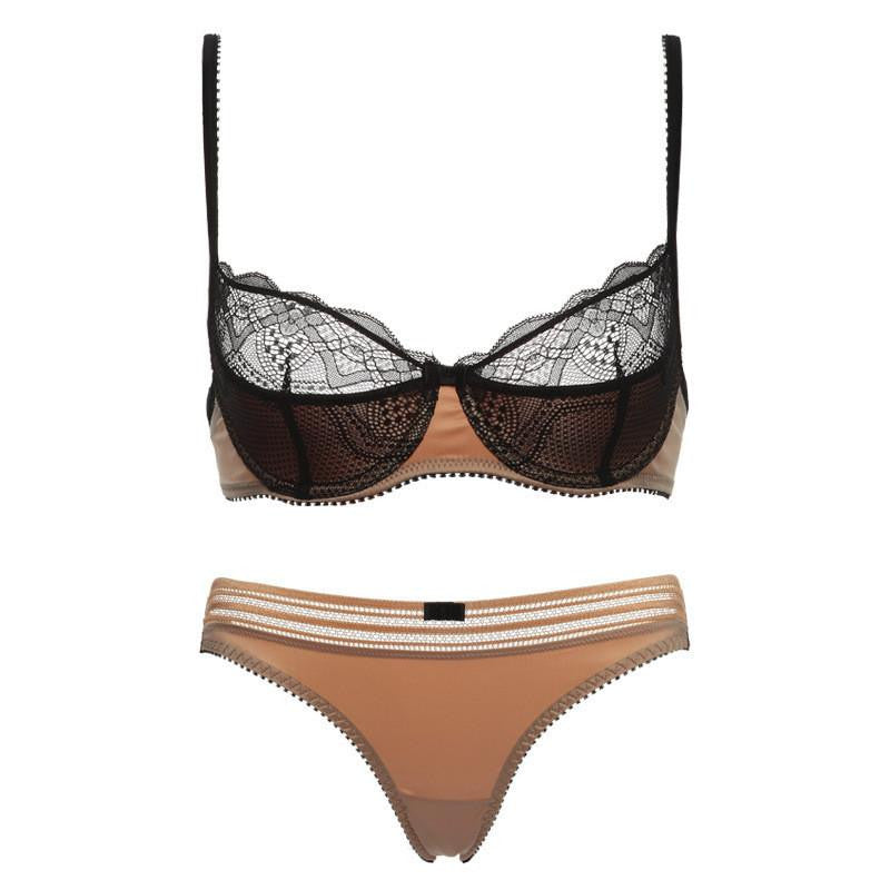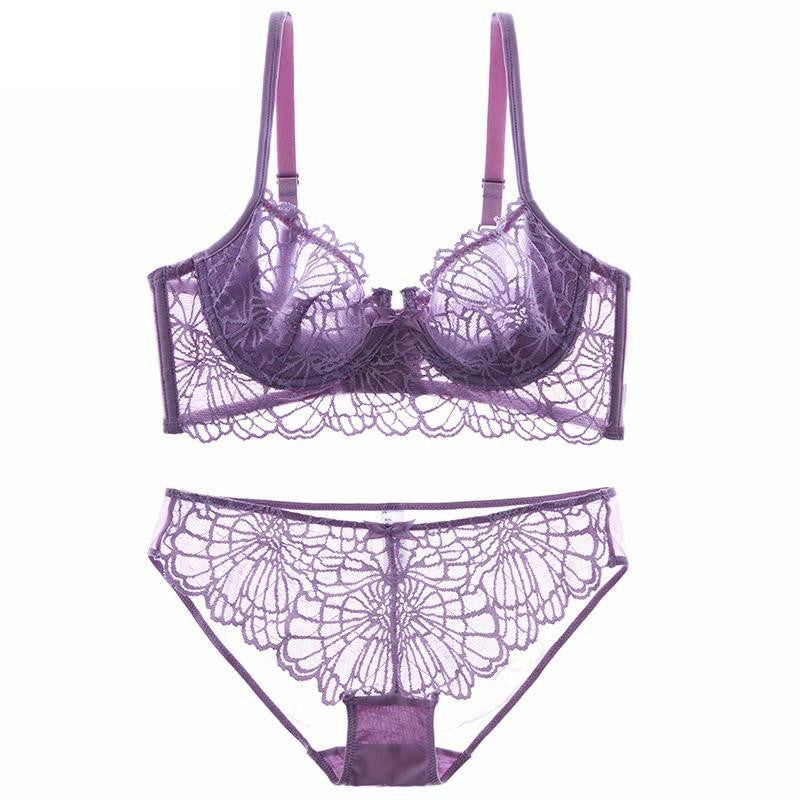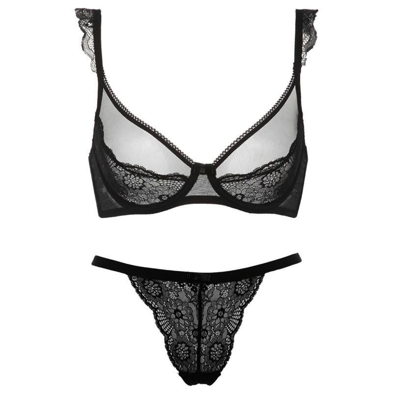 Get this hallow transparent two piece bra set comes with adjustable straps and fully supported with under- wire. Order your half cup size lace sets. Â A sexy and comfortable look with lace trimmed edges.