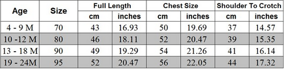 This stylish jumpsuit is available in sizes ranging from 4 to 24 months. Please contact us for detailed sizing information to ensure the best fit for your growing baby.