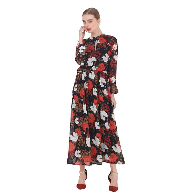 Step into elegance with our women red Floral print Chiffon dress long sleeved maxi dress, a stunning addition to your wardrobe that combines comfort and style effortlessly. This ankle-length dress features a captivating floral print that adds a touch of vibrancy to any occasion, making it perfect for both casual outings and special events.