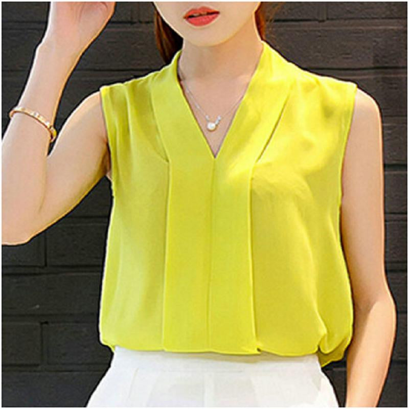 Get this chiffon top with V-neck this summer. This sleeveless solid top is regular and come in many colors.