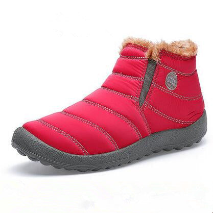 Flat heel, slip on, plush lining, round toe,akle length, plain decorations,soft leather adult winter boots, with waterproof cloth and ultralight sole.