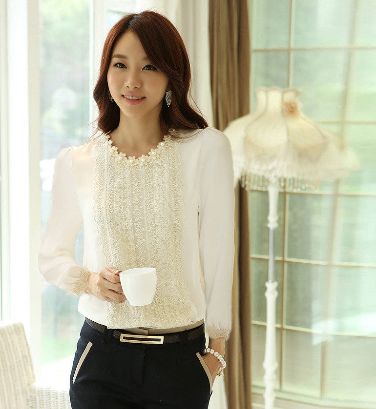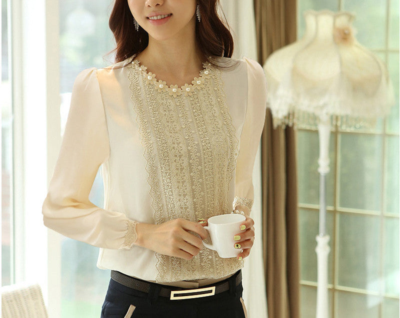 Elevate your wardrobe with our stunning Women Tops And Blouses Fashion Shirt Shirts Long Sleeve Lace Blouse. This exquisite piece combines elegance and versatility, making it the perfect choice for any occasion, whether it's a professional meeting or a casual outing. Crafted from high-quality chiffon, this long-sleeve blouse features a delicate lace design that adds a touch of femininity and sophistication to your look.