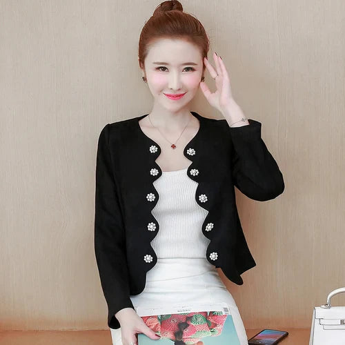 This long sleeve jacket features a chic O-neck collar and covered button closure that enhances its sleek silhouette. Available in classic colors such as white, red, and black, it effortlessly complements any outfit. The pearl decorative elements add a touch of sophistication, making it a standout piece in your wardrobe.