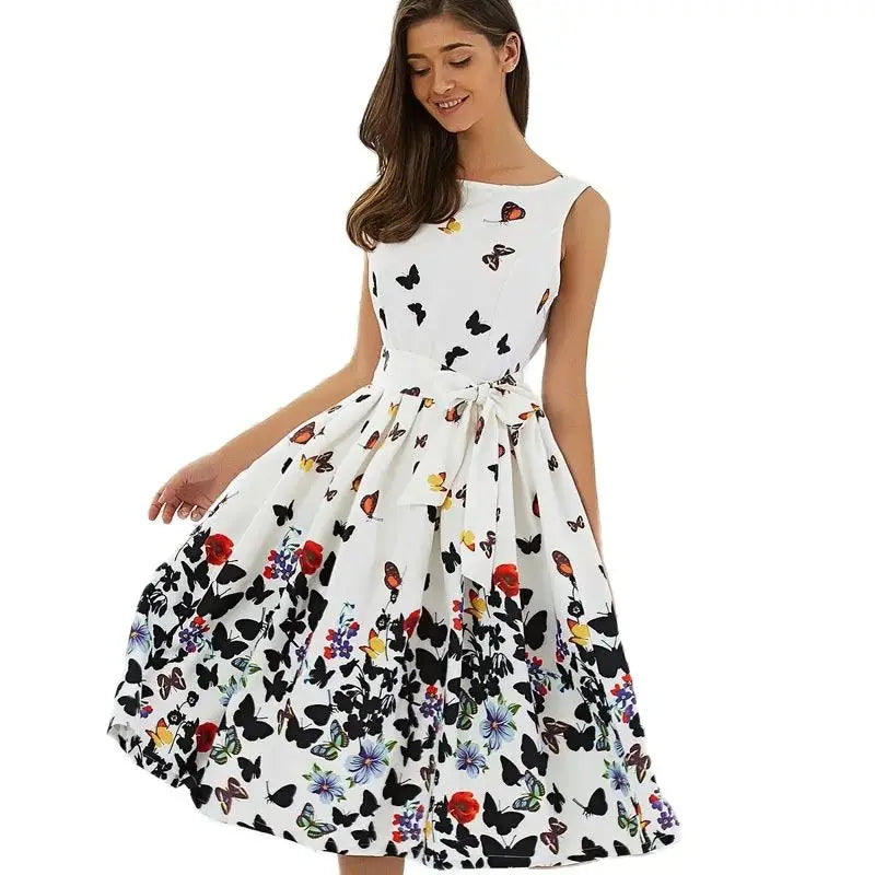 This Crewneck sleeveless garden print women's pleated lace-up dress with playful cute mid-length dress is not just a fashion statement; it's a celebration of individuality. Pair it with sandals for a daytime look or dress it up with heels for an evening event. This dress truly transitions easily from day to night.