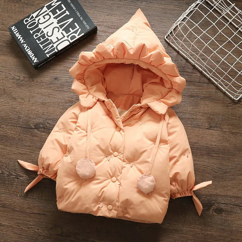 This adorable hooded cotton coat is perfect for keeping your baby girl warm and stylish during the chilly seasons. Featuring a cozy padded design and cute cherry embroidery, this fashion outerwear is sure to be a hit. Get ready to bundle up your little one in this charming coat!
