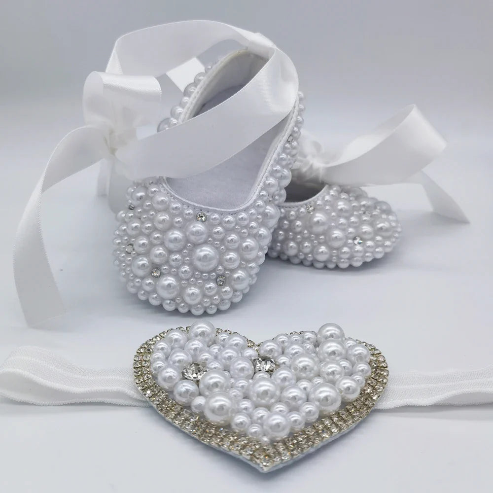 Step up their style game with these handmade white pearls bling rhinestone crib shoes! Perfect for christenings, weddings, or baptisms, these shoes will add sparkle to any outfit. Suitable for babies 0-12 months. Give them a touch of elegance early on!