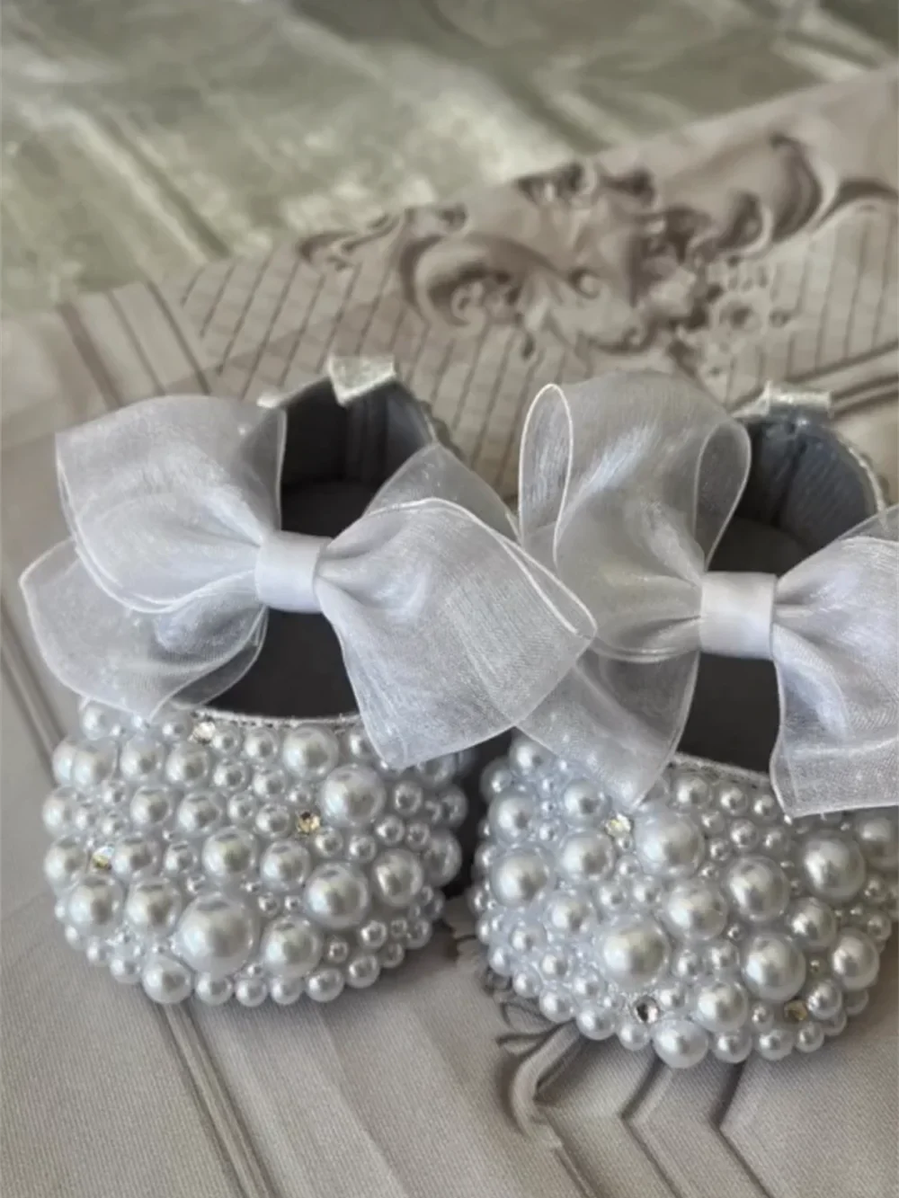 Introducing our exquisite Handmade White Pearls Bling Rhinestone Baby Crib Shoes Christening Outfit Wedding Sparkle Organza Baptism 0-3m Shoes. These stunning crib shoes are the perfect accessory to elevate your little one's special occasions, whether it's a christening, wedding, or baptism. Adorned with shimmering rhinestones and delicate white pearls, these shoes are designed to add a touch of elegance and sparkle to any outfit.