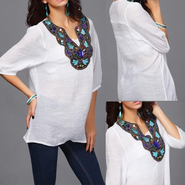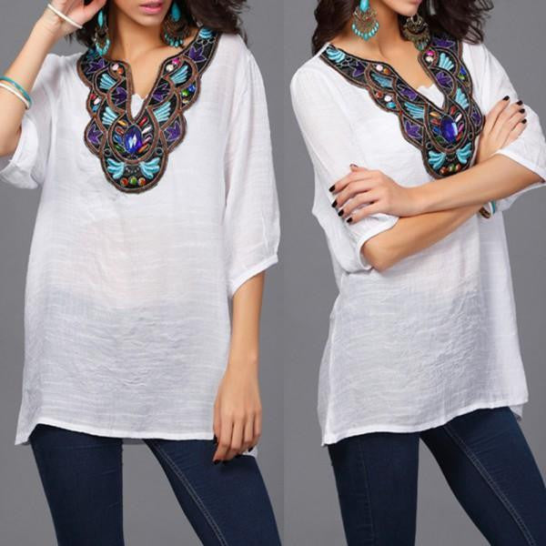 Embrace your unique style with the Women Ethnic Embroidery Long Tops Blouse 3/4 Sleeve Pullover Shirt. Its blend of comfort, style, and versatility ensures you'll look and feel your best no matter the occasion. Don't miss out on this elegant piece that is designed to accentuate your beauty. Order yours today!