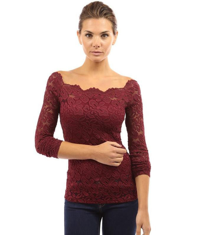 Look great in lace this red printed lace 3/4 sleeve as an excellent choice the summer. With a scoop neckline get the piece into your closet today.
