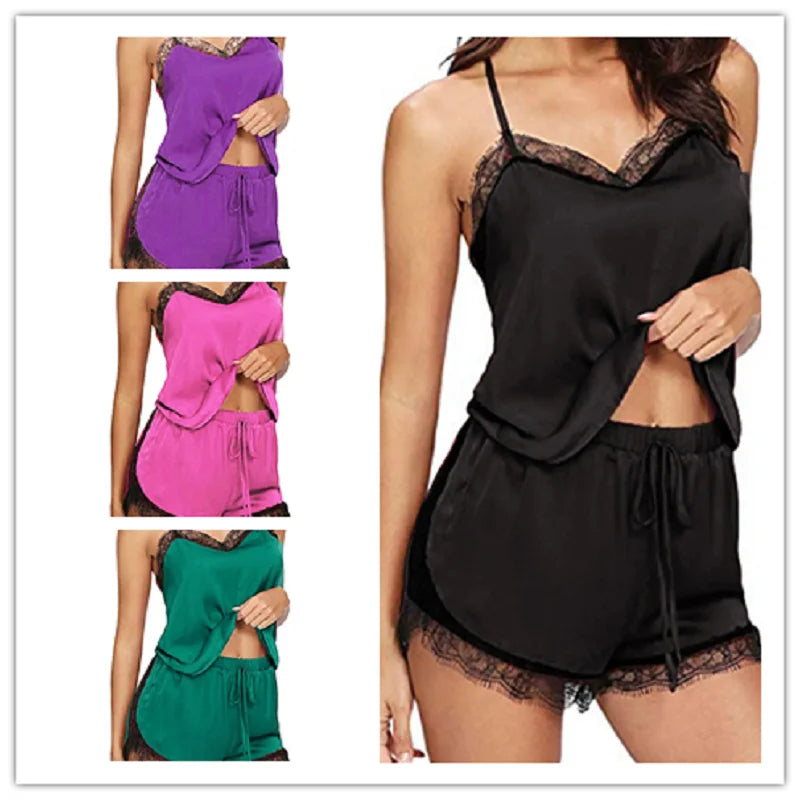 Indulge in luxurious comfort and irresistible style with our Women Pyjamas Suit V-Neck Stretch Satin Babydoll Lace Sexy Lingerie Bowknot Sleep Shorts Set Sleepwear. This exquisite sleepwear set is designed for the modern woman who appreciates both fashion and functionality. Made from high-quality stretch satin, it offers a soft, comfortable fit that feels as good as it looks, perfect for a restful night's sleep.