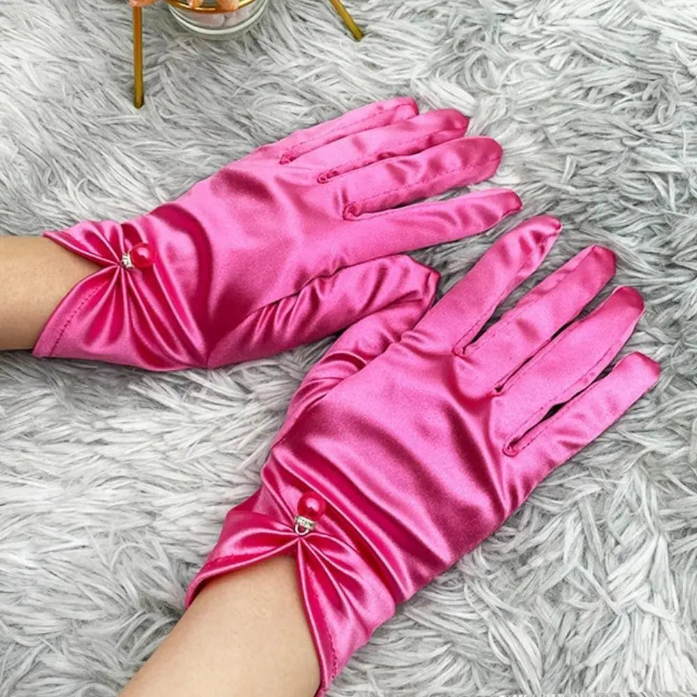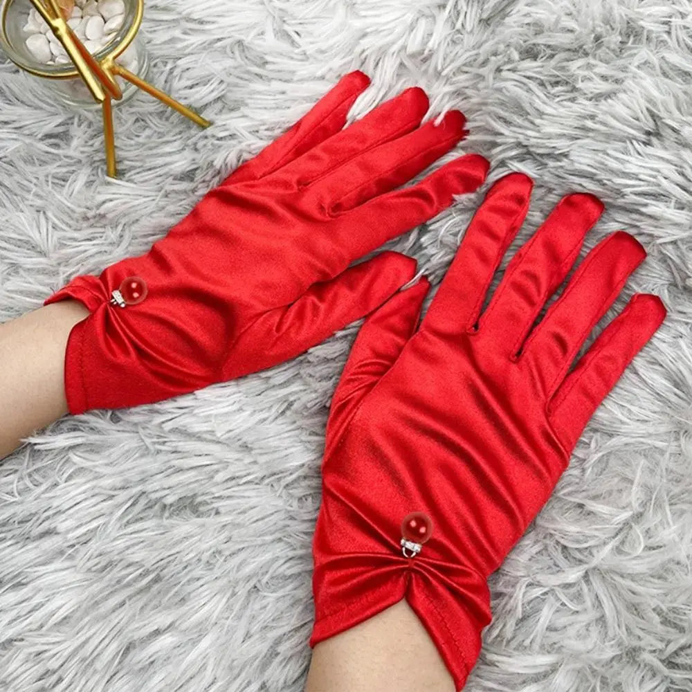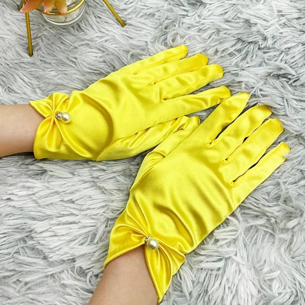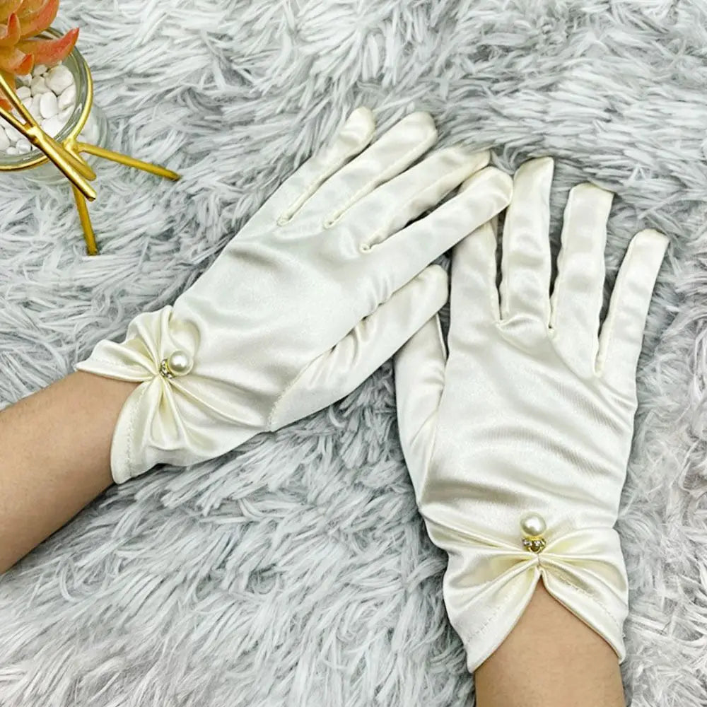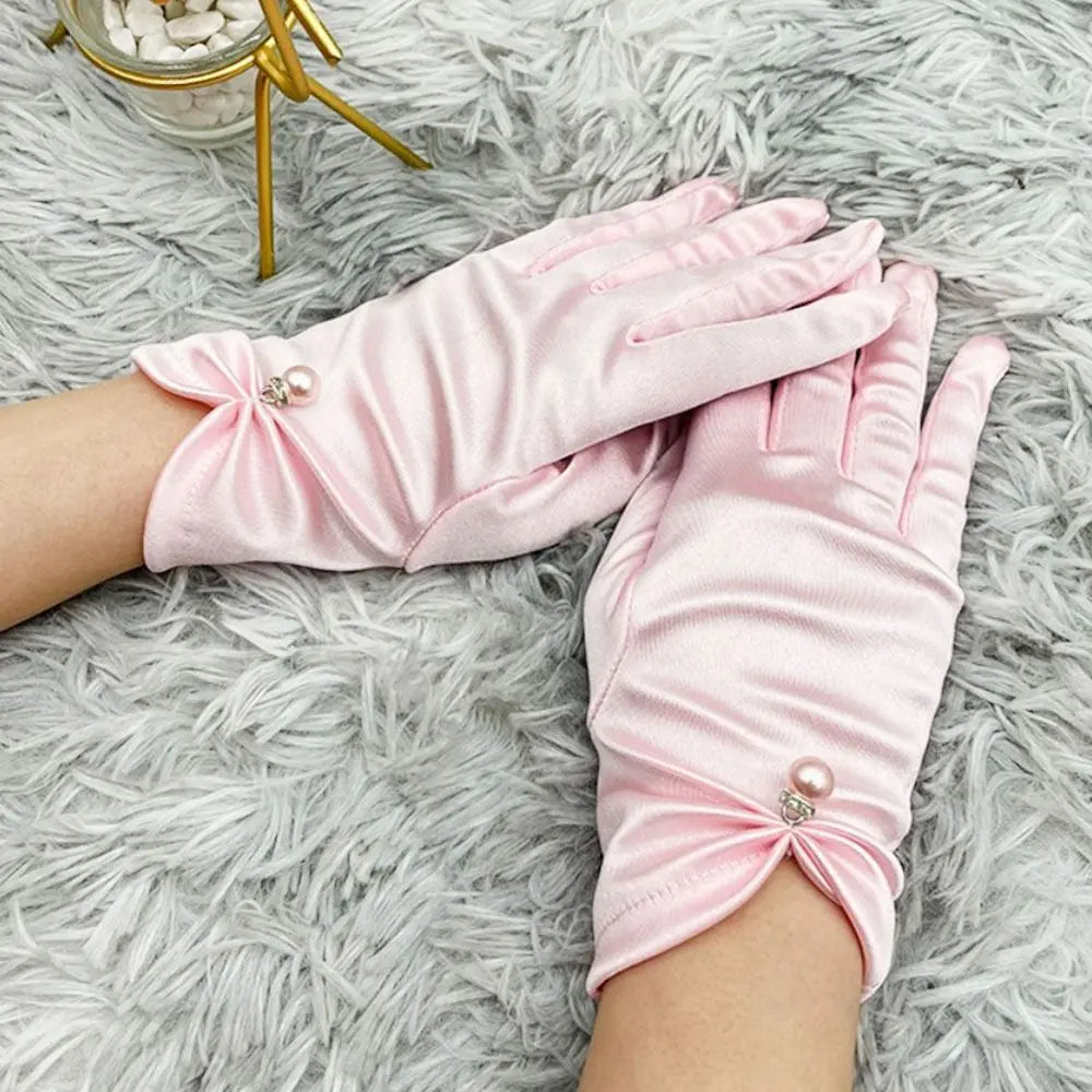 Introducing our Women Wrist Length Gloves Sexy Elegant Pearl Bowknot Short Satin Stretch Gloves for Ladies Girls Hand Gloves Sunscreen, designed to elevate your style while providing essential sun protection. These exquisite gloves are crafted from high-quality satin and feature a stretchable material that ensures a comfortable fit for all hand sizes. The stunning pearl bowknot detail adds a touch of charm, making them a perfect accessory for any occasion.