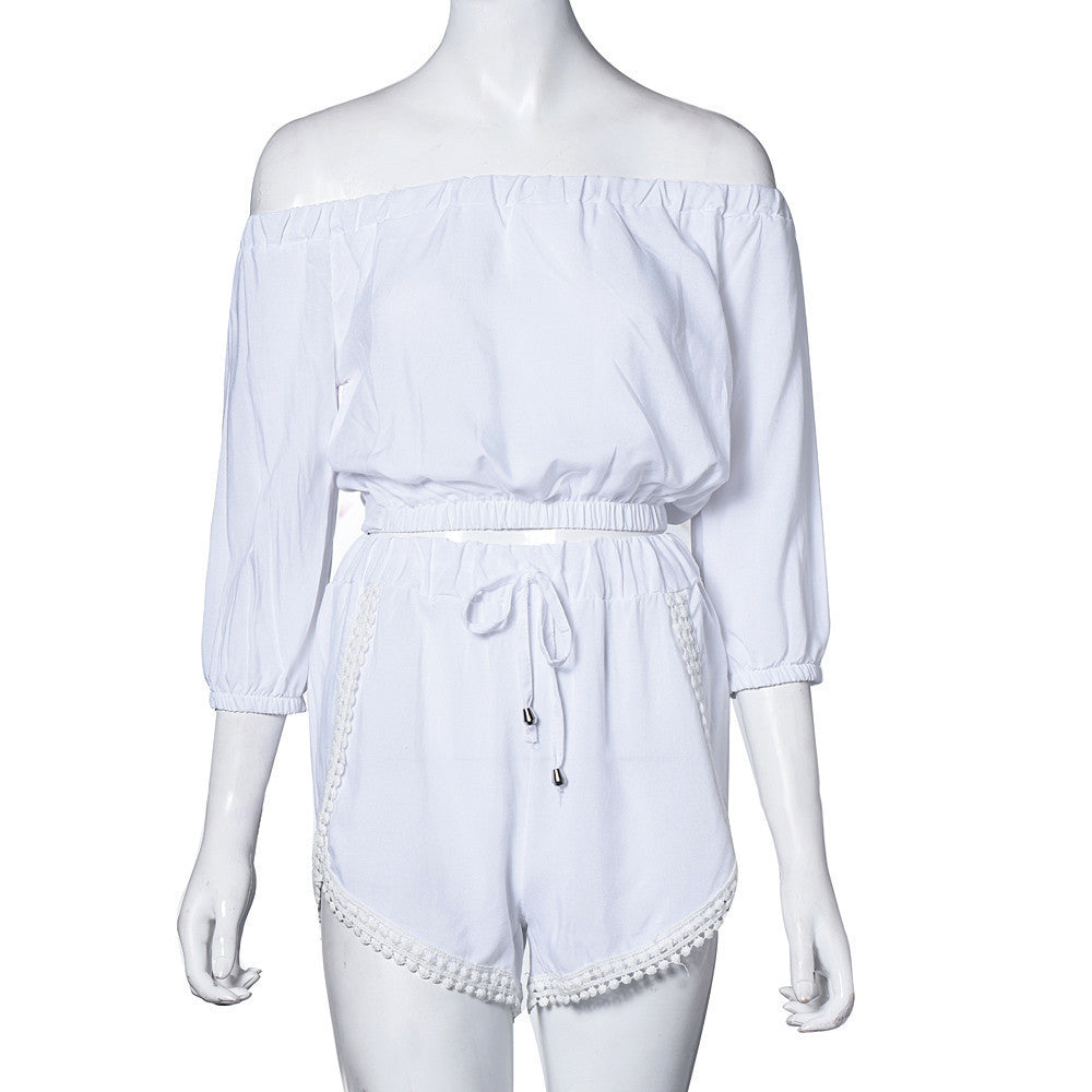 Experience the blend of comfort and style with our Casual 2 Pieces Set Dress Women's Off Shoulder Solid Color Lace Dress Suit Beach Wear vestidos. Order yours today and elevate your summer fashion game!