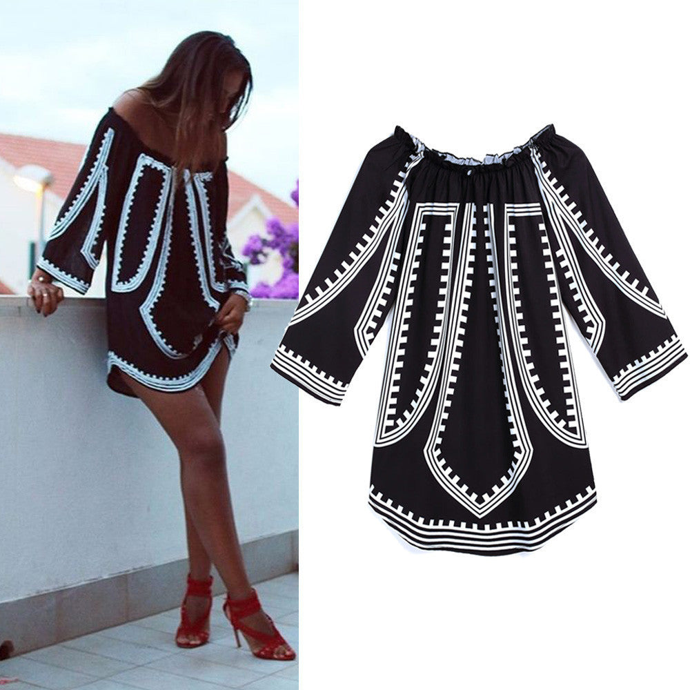 Elevate your summer wardrobe with the stunning Women Dress Casual Off Shoulder Long Sleeve Loose Print Tops Blouse Party Beach Mini Dress. This versatile dress is perfect for those sunny days at the beach or lively evening parties. Designed with a chic off-shoulder neckline and loose fit, it provides both style and comfort, making it a must-have for every fashion-forward woman.