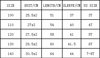100(3T) 110 (4T) 120(5T) 130 (6T) 140(7-8T) (for about 3-8T) ( You can choose the size what you want) |