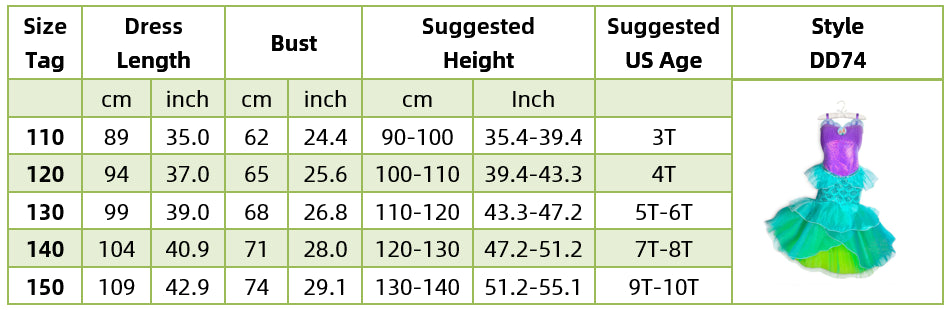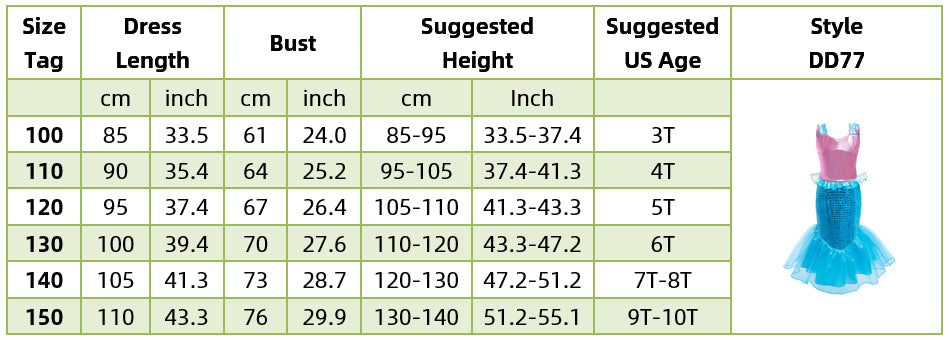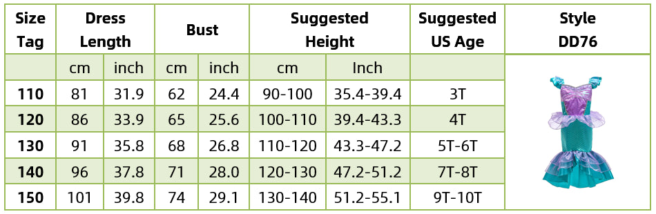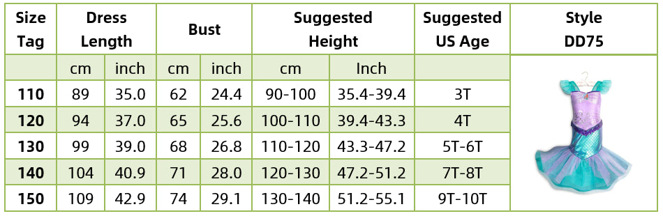 Available in sizes for children aged 3 to 10 years, this costume is designed to fit true to size. Whether your little girl is dressing up for a carnival, a themed party, or just for fun, this dress will make her feel like a true princess. With a variety of sizes (100-150) to choose from, finding the perfect fit is a breeze!