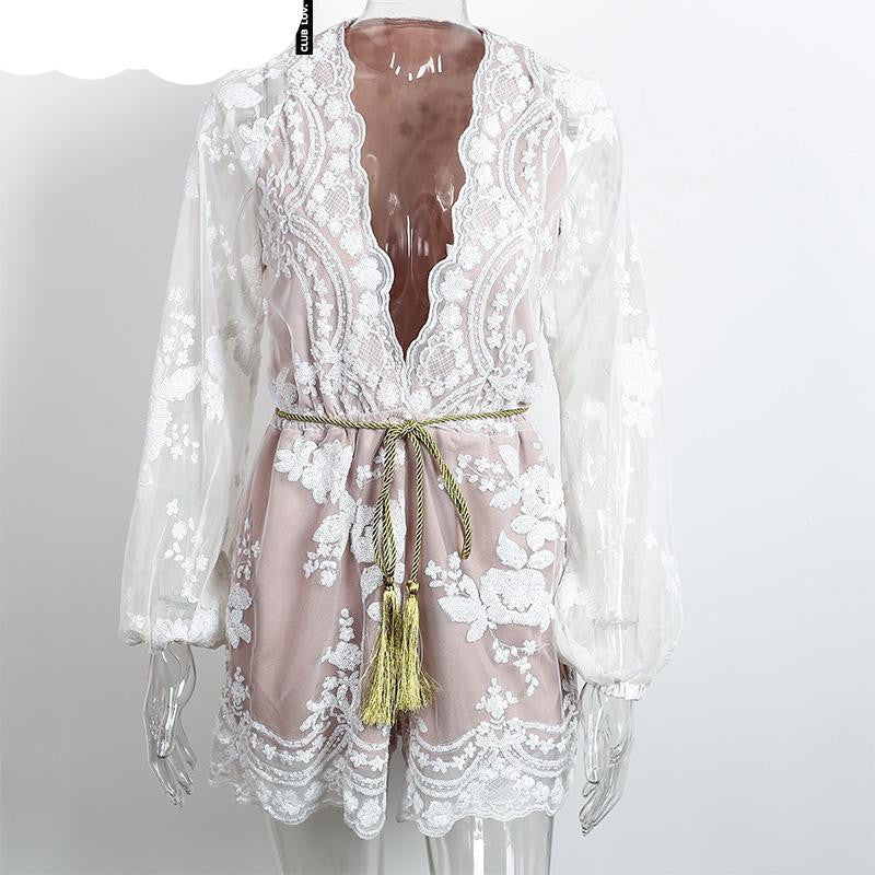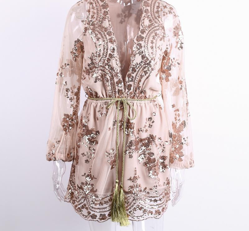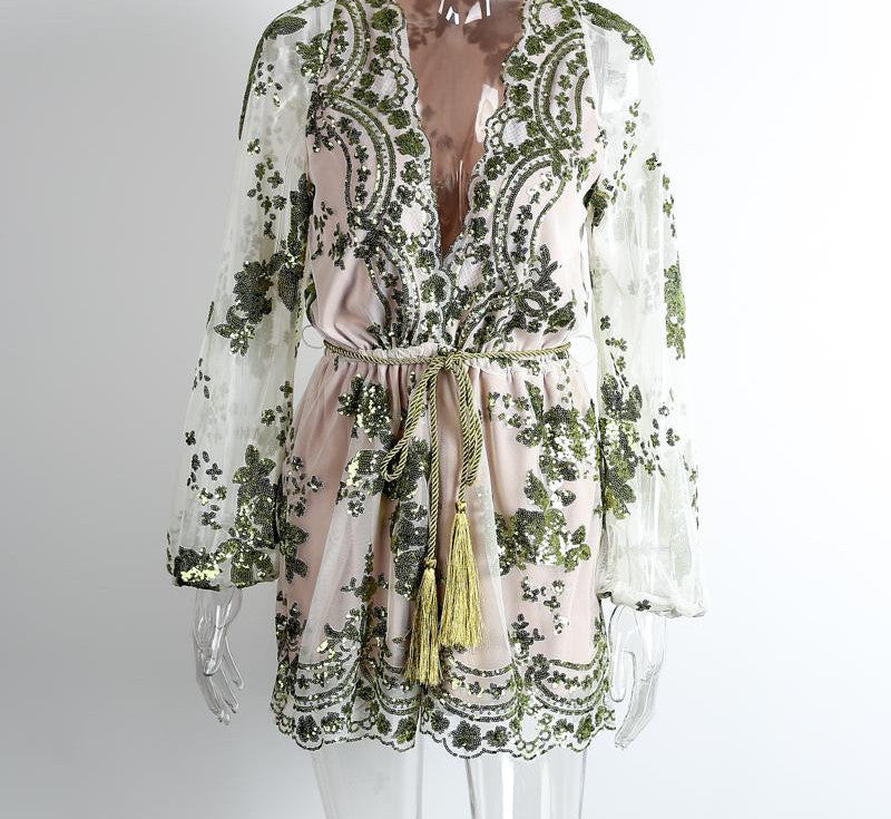 The deep V-neckline and elegant sequin embellishments create a captivating look that radiates glamour. With its stylish tassel waistband, you can easily adjust the fit to enhance your silhouette, making it perfect for various body types.
