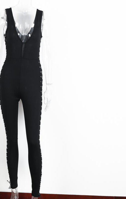 Introducing the Deep v neck sleeveless side lace up jumpsuit romper bandage elegant jumpsuit women Long pants slim sexy playsuit, a stunning addition to your wardrobe that combines elegance and sensuality. This chic jumpsuit is designed to enhance your silhouette, making it perfect for parties, nights out, or any special occasion where you want to make a lasting impression.