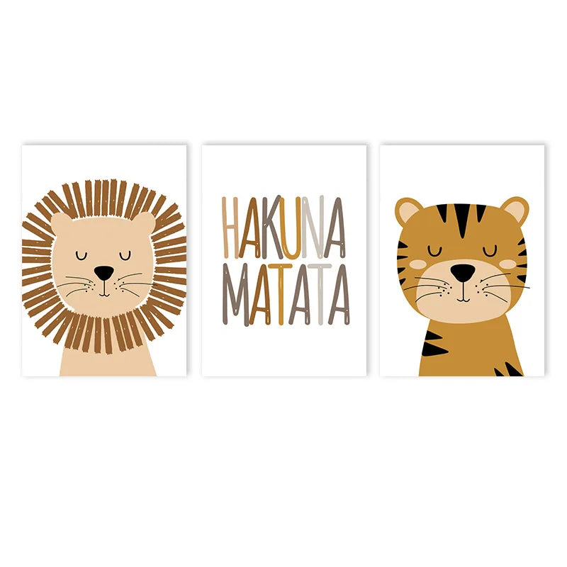 Transform your child's space with the HAKUNA MATATA Art Poster Baby Nursery Canvas Print Lion Animal Painting Tiger Posters Nordic Wall Pictures Kids Room Decoration. This delightful canvas print features enchanting artwork of a lion and tiger that captures the essence of adventure and imagination. Perfect for adding a whimsical touch to nurseries or playrooms, this vibrant piece is designed to inspire creativity and a sense of freedom in your little ones.
