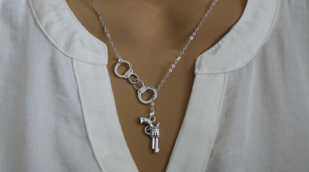 Elevate your jewelry collection with this exquisite pendant necklace that perfectly balances style and individuality. Shop now and embrace your bold side with the Handcuff and Gun Necklace!