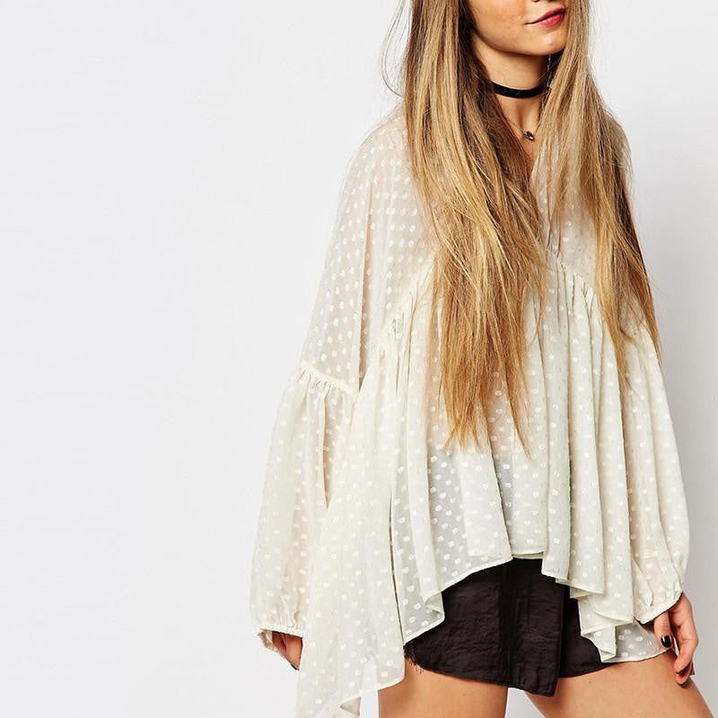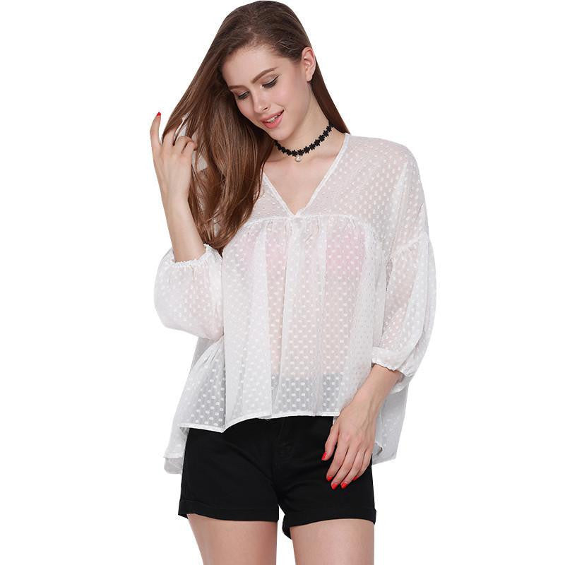 This Women Fashion Deep V Neck Casual Loose Lantern Asymmetrical Sheer Mesh Dot Chiffon is designed for the modern woman who values both fashion and function. Whether you’re dressing up for a night out or looking for a casual day look, this top is your go-to choice. Don’t miss out on adding this versatile piece to your collection!