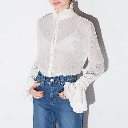 Embrace style and comfort with the Womens Lace Hollow Out Sheer Flare Sleeve Buttons Blouses Shirts Casual Solid. Order yours today!