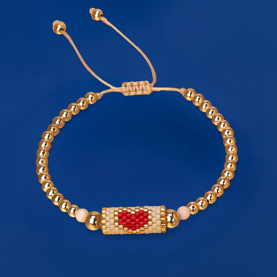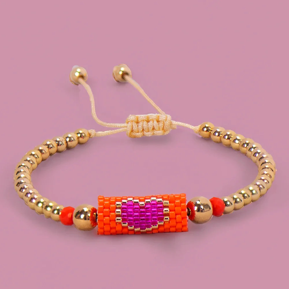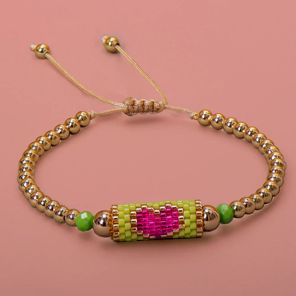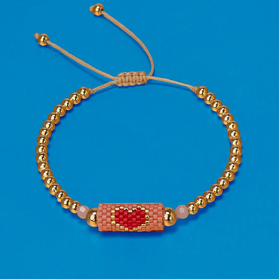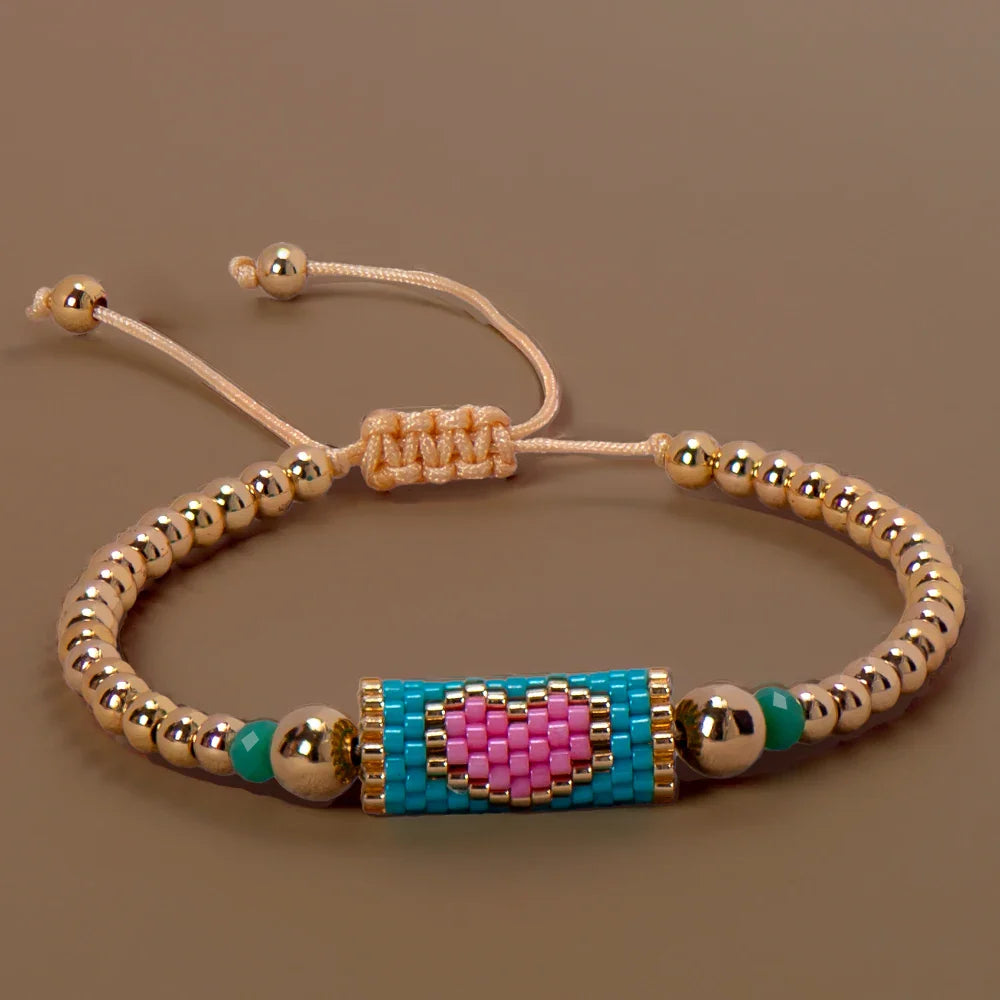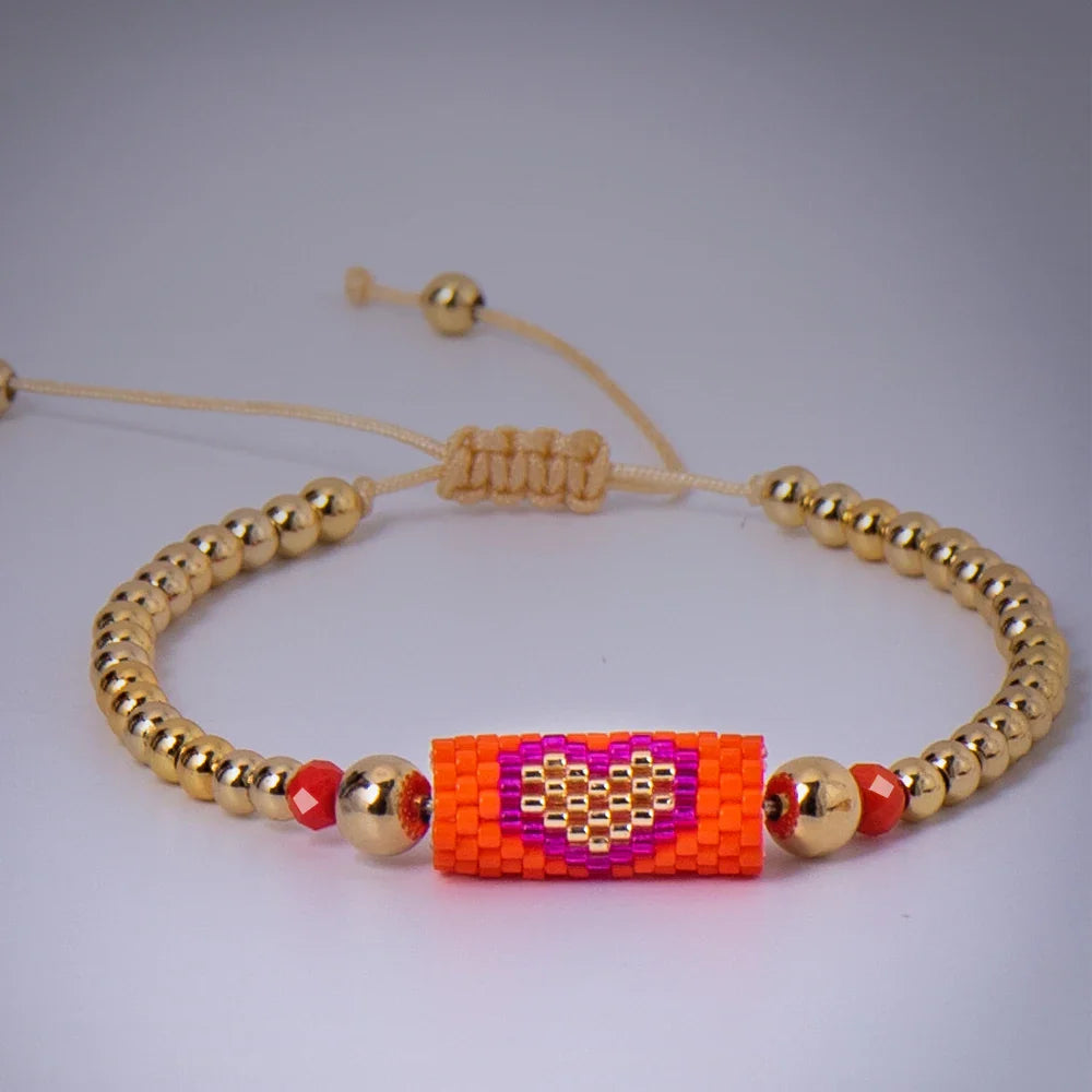 Indulge in the beauty of this handmade Heart Miyuki Bracelet, perfect for fashion lovers! With its adjustable woven design, it fits comfortably on any wrist. The hard golden plated beads add a touch of elegance, making it an ideal accessory for any summer outfit. Order yours today!