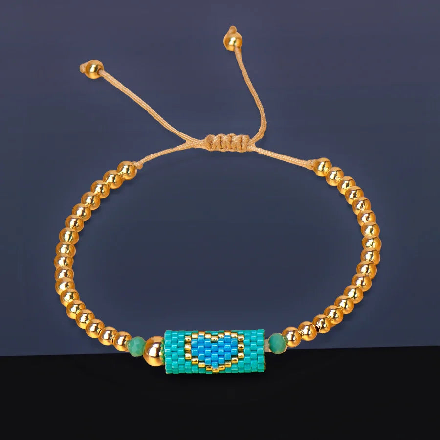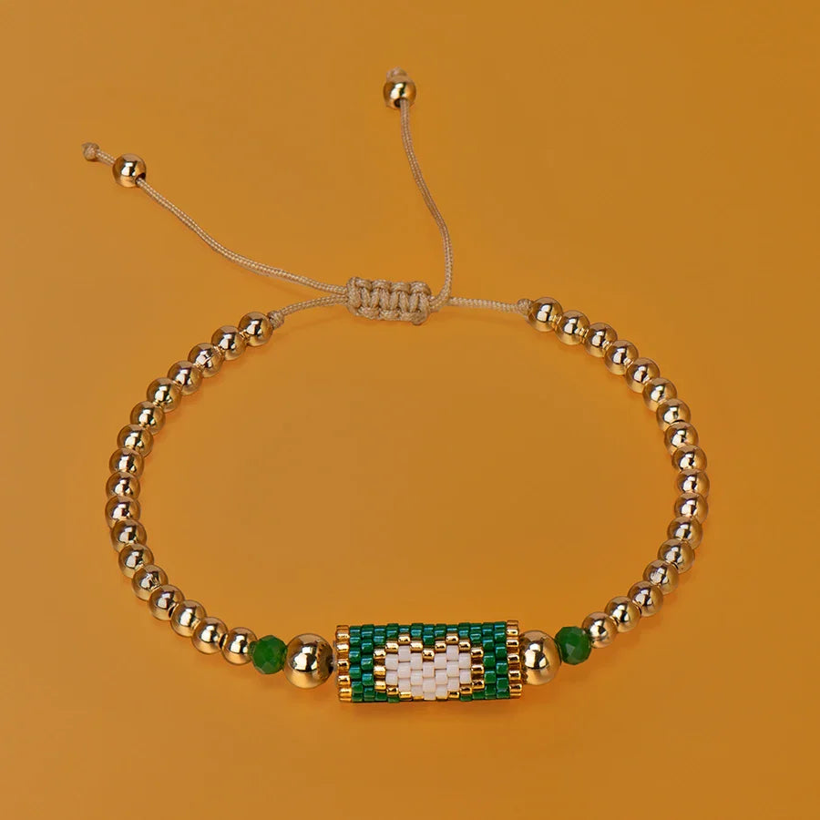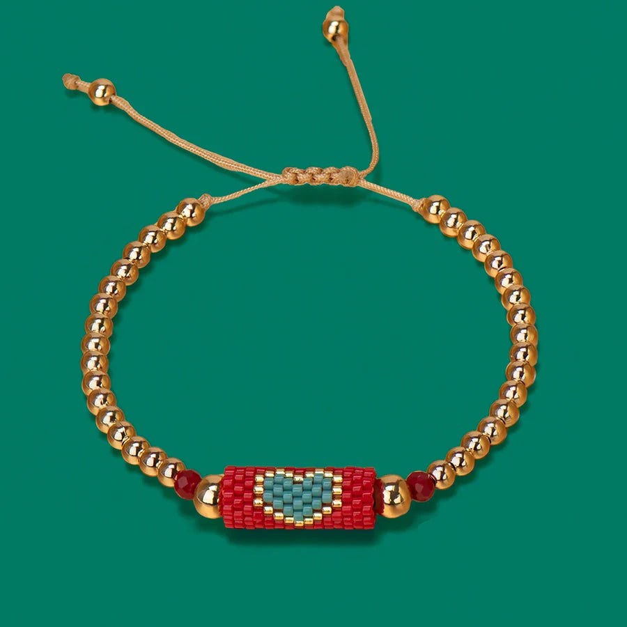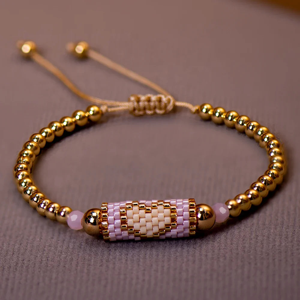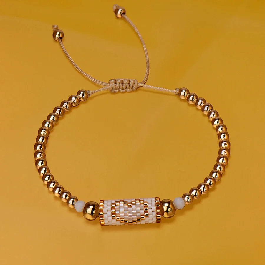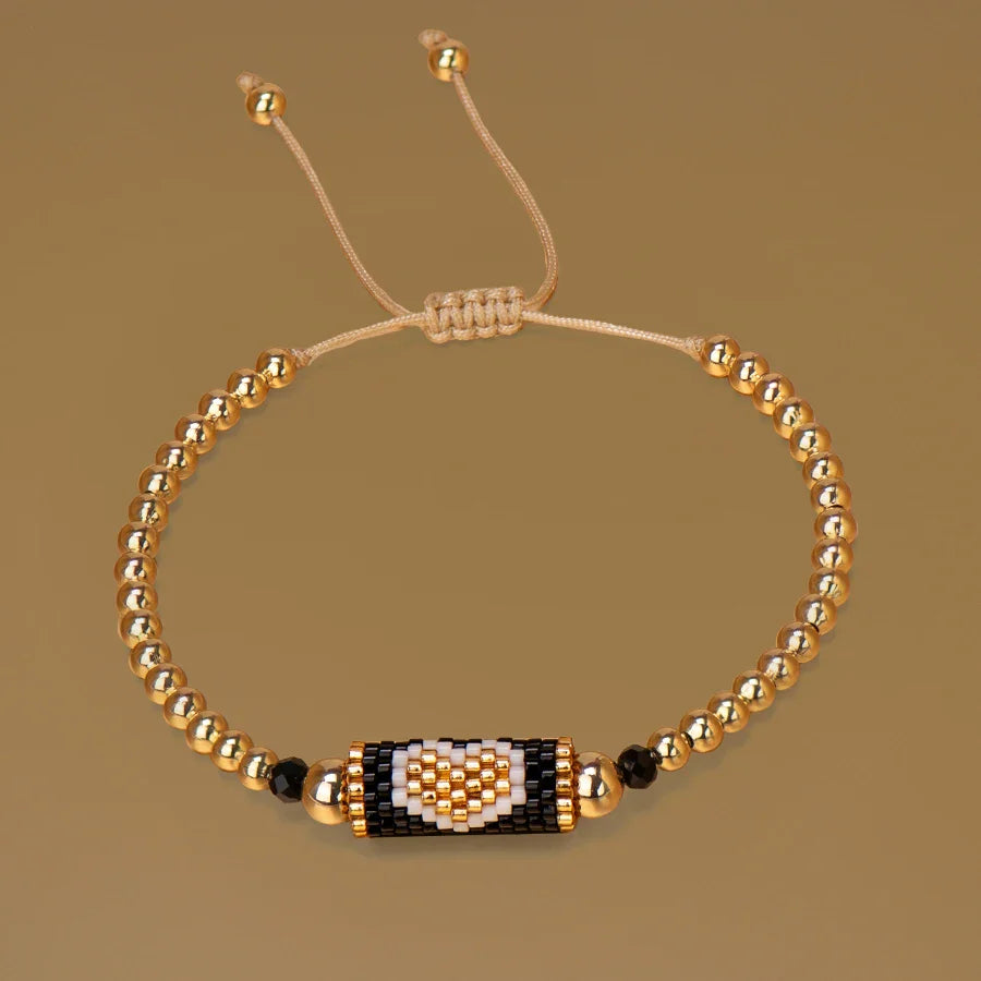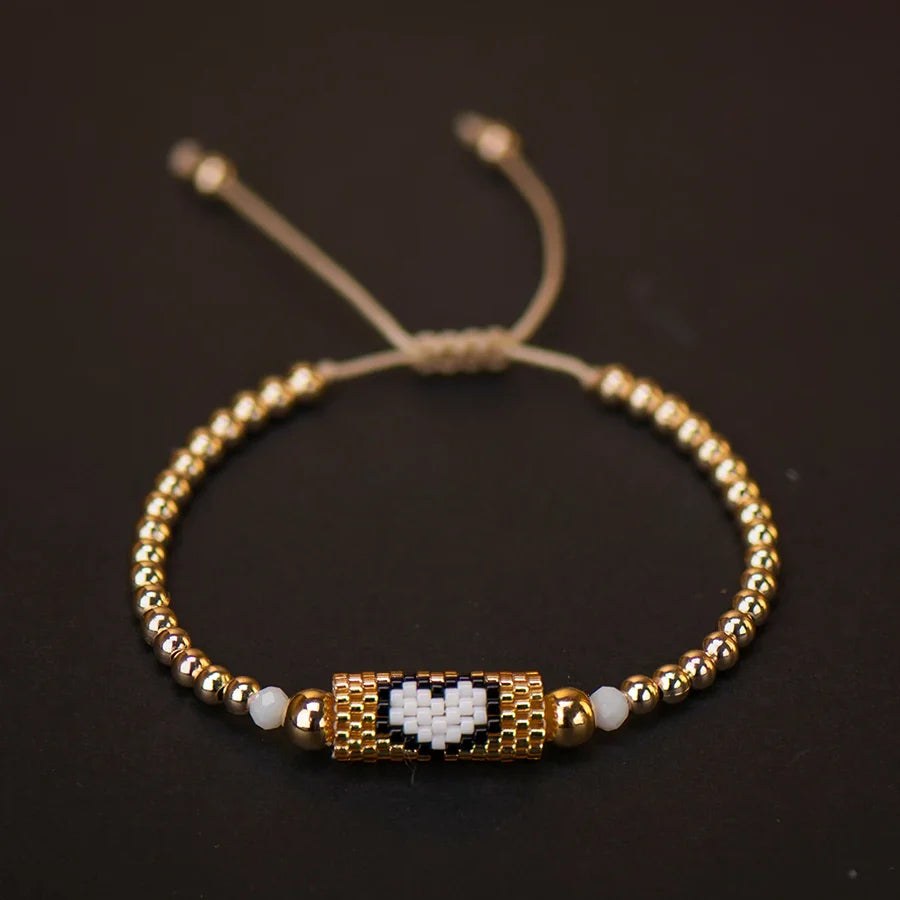 Indulge in the beauty of this handmade Heart Miyuki Bracelet, perfect for fashion lovers! With its adjustable woven design, it fits comfortably on any wrist. The hard golden plated beads add a touch of elegance, making it an ideal accessory for any summer outfit. Order yours today!